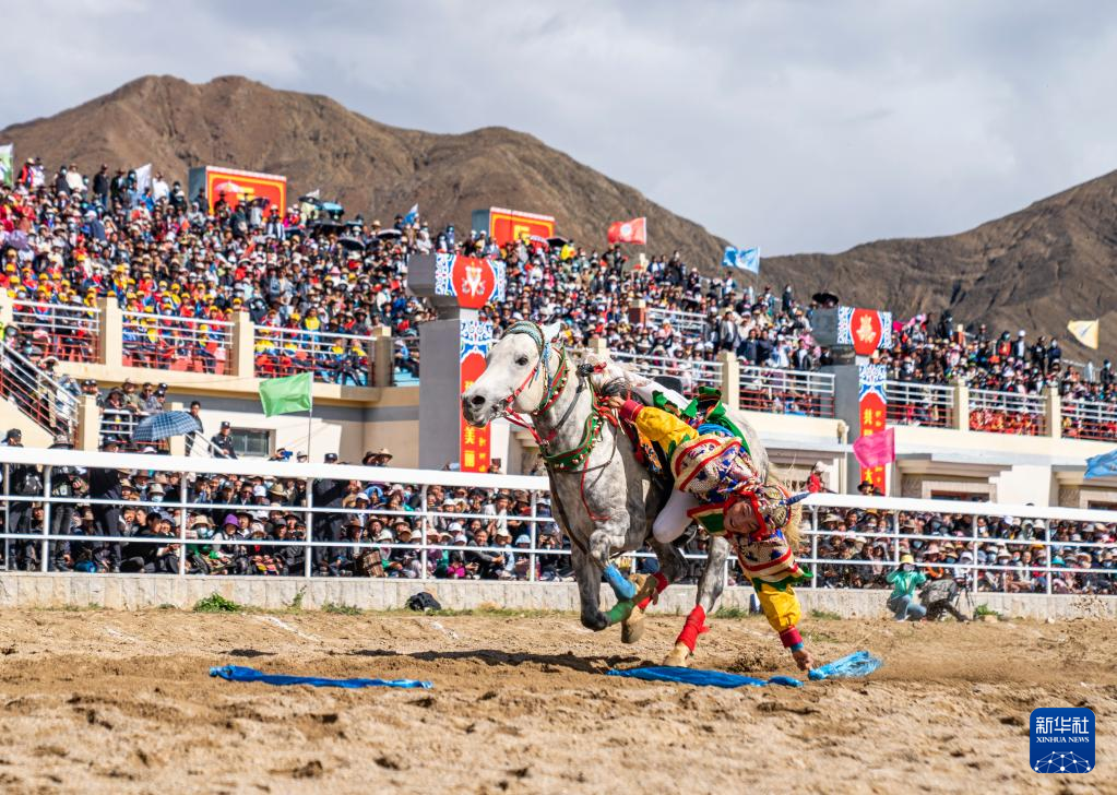 6月20日,在賽馬活動現場,騎手正在表演馬上拾哈達。新華社記者 孫非 攝