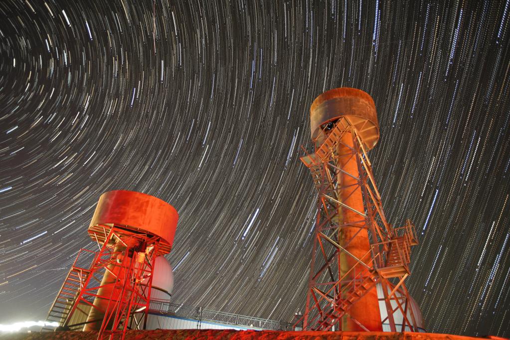 在拍攝天文臺(tái)星軌時(shí),天空已經(jīng)完全黑了,在相機(jī)的取景器里并不能實(shí)時(shí)看見(jiàn)天空和星星以及其他的拍攝對(duì)象,這時(shí)候我們只能先長(zhǎng)曝光拍一張圖,再結(jié)合自己拍好的圖,根據(jù)感覺(jué)來(lái)慢慢調(diào)整構(gòu)圖,再進(jìn)行曝光拍攝。如此經(jīng)過(guò)三四次長(zhǎng)曝光拍攝以后,才拍到了自己想要的圖片,我的一張星軌照片就是這樣被拍攝了出來(lái)。