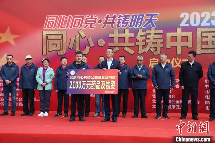 圖為啟動儀式上,北京同心共鑄公益基金會向昌都市捐贈了價值2100萬元人民幣的藥品及物資。 中新社發 “同心·共鑄中國心”組委會宣傳處 供圖