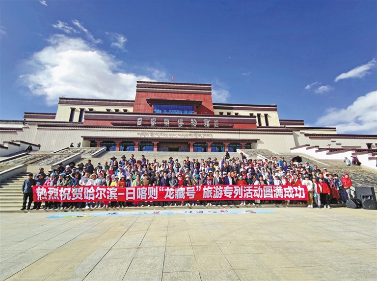 圖為從黑龍江省哈爾濱市乘坐2023年首趟“龍藏號”旅游專列的數百名游客順利抵達日喀則,并在日喀則博物館合影留念(6月2日攝)。記者 汪純 攝