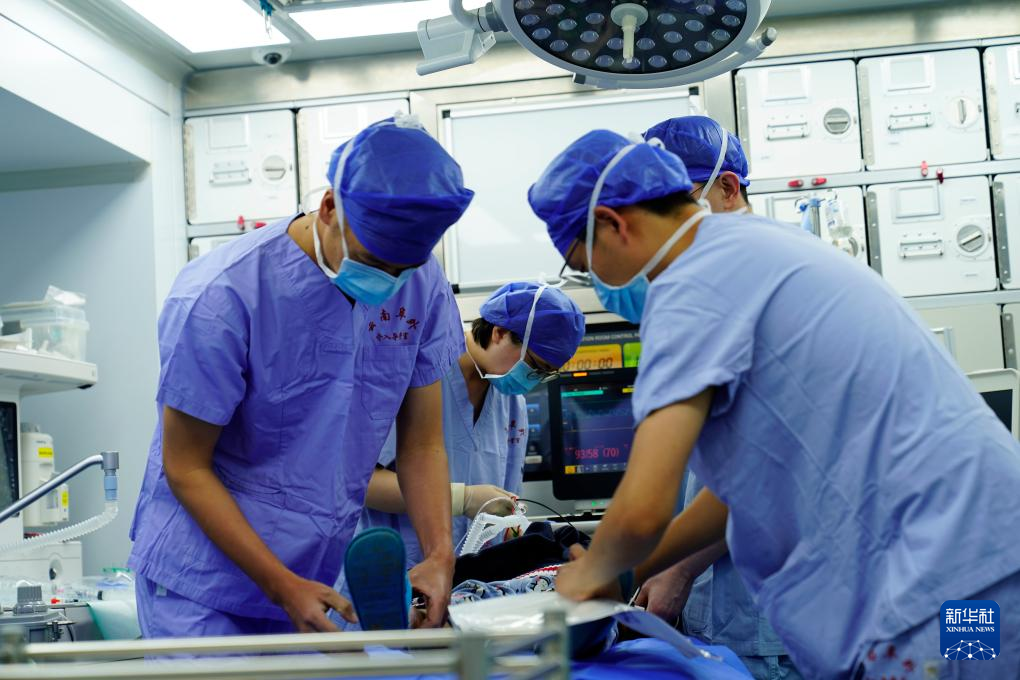 醫護人員在移動介入治療手術車上為先心病患兒進行微創手術。新華社記者 劉洪明 攝