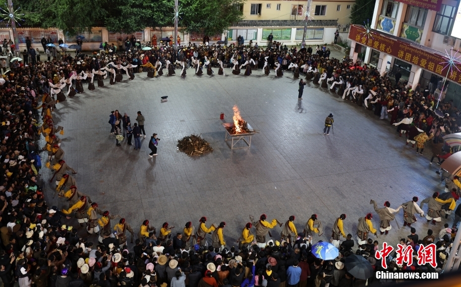 7月15日,西藏自治區(qū)昌都市貢覺縣阿旺綿羊文化商貿(mào)旅游節(jié)在當(dāng)?shù)嘏e行。當(dāng)?shù)孛癖娫陂_幕式前夜點起篝火,載歌載舞歡迎各地游客。