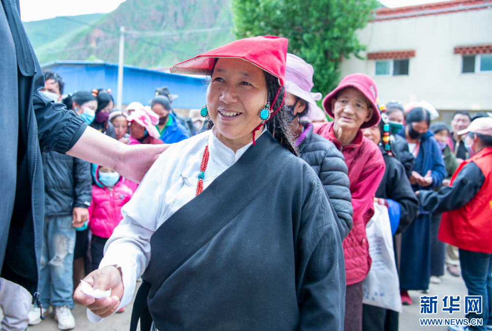 7月12日,群眾在西藏丁青縣西藏丁青縣尺犢鎮看完病后拿到組委會捐贈的藥品。新華網 旦增努布 攝