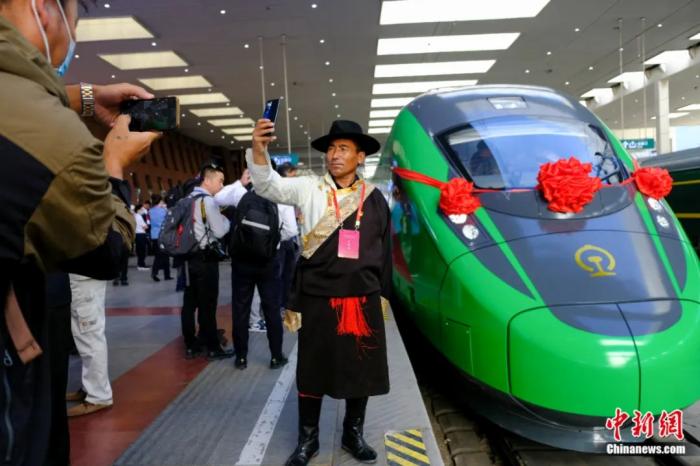 2021年6月25日,川藏鐵路拉林段(拉林鐵路)正式開通運營。民眾在拉薩火車站復興號車頭前自拍留念。江飛波 攝