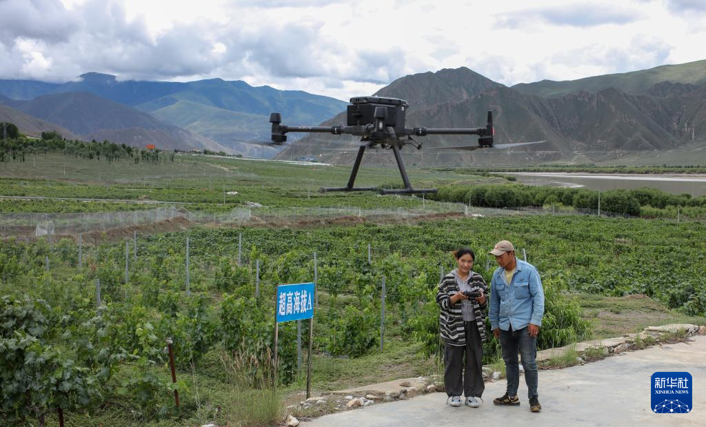 7月26日,桑日縣一家葡萄酒企業的員工曲珍(左)在葡萄園里向技術員何志榮學習使用農用無人機。新華社記者 姜帆 攝