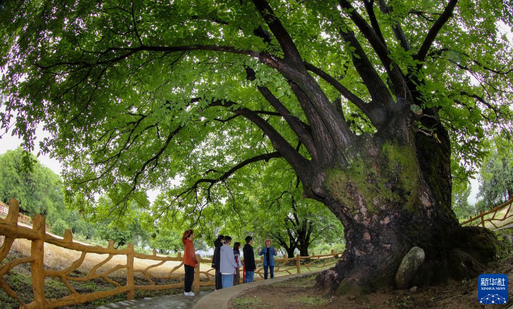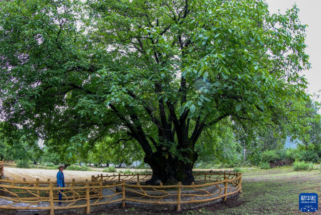 劉利平博士在加查縣安繞鎮熱果村查看一株樹齡1800余年的古核桃樹(7月27日攝)。新華社記者 旦增尼瑪曲珠 攝