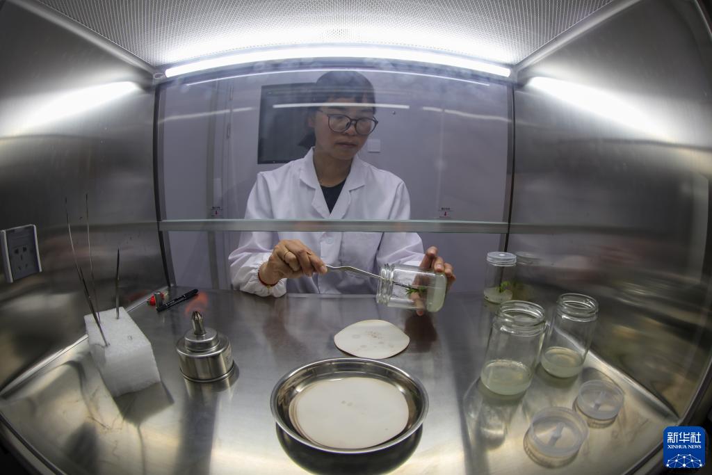 劉利平博士在高原核桃研究所用核桃組織培養標本做實驗(7月27日攝)。新華社記者 姜帆 攝
