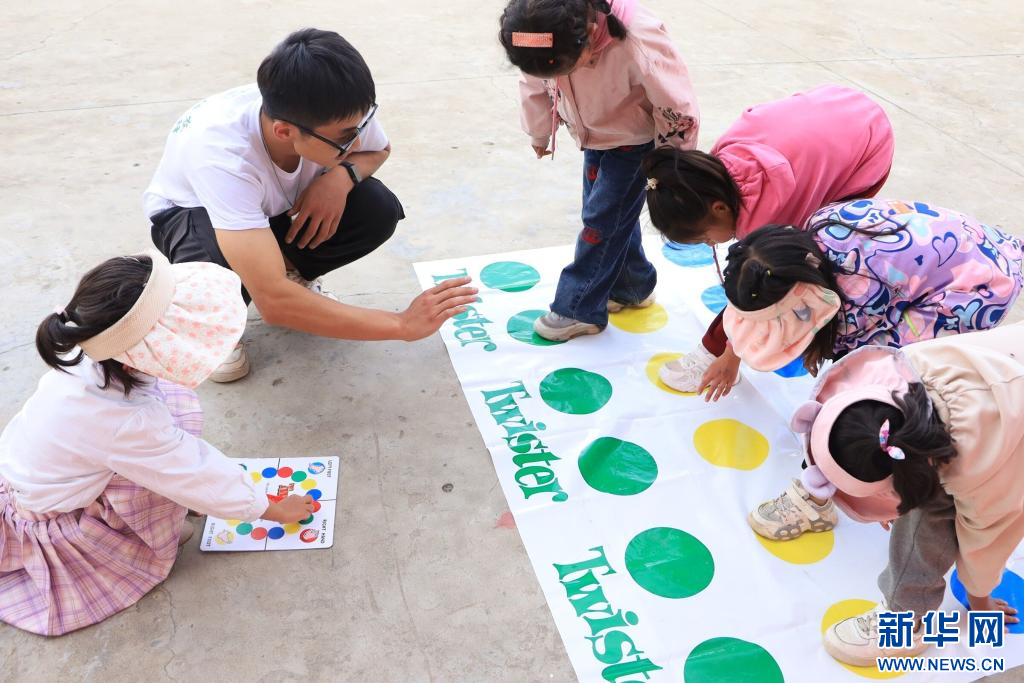中國農業大學峰云社人文科考隊隊員帶領孩子們進行課外活動。新華社發