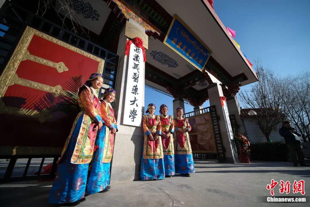 2018年12月28日,西藏藏醫學院更名為西藏藏醫藥大學揭牌儀式在拉薩舉行,該校學生在校門前合影留念。何蓬磊 攝