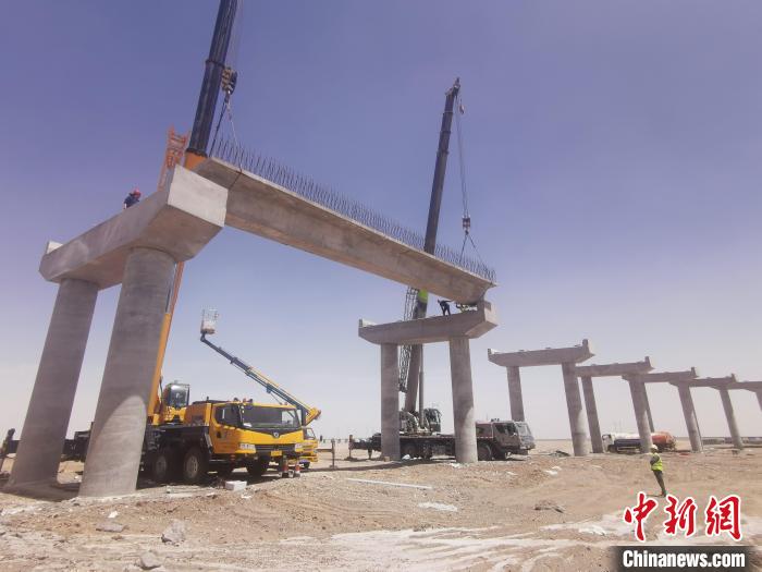 據介紹,跨青藏鐵路轉體橋梁設計長度687米,分主橋和引橋兩部分,引橋共設計箱梁116片。預制箱梁架設屬于高風險施工,本次架設的首片箱梁設計長度20米,重量55噸,采用兩臺大型汽車吊協同作業完成架設。