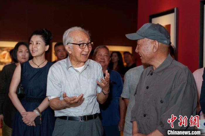“藏色——巴瑪扎西畫展”亮相中國美術(shù)館,圖為中國美術(shù)家協(xié)會名譽(yù)主席、著名畫家靳尚誼(前排左一)與藏族畫家巴瑪扎西(右一)交流。 伴藏文化供圖
