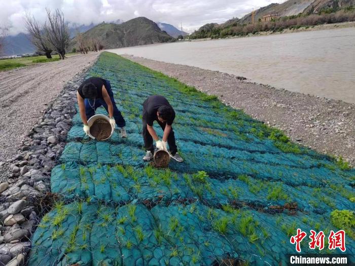 圖為工人們對生態袋進行養護。中國水電基礎局西藏分公司供圖