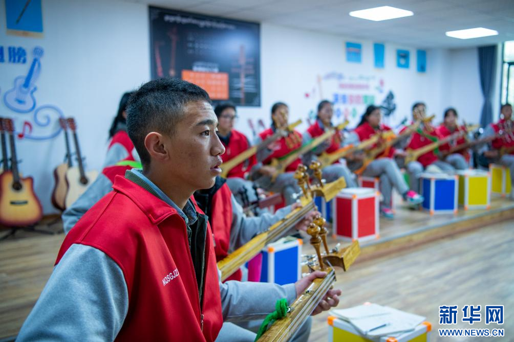 圖為那曲市高級中學學生在彈奏扎念琴(9月5日攝)。新華網 旦增努布 攝
