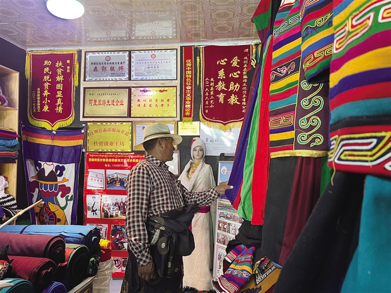 8月的阿里天高云淡,在藍天白云的映襯下,阿里地區改則縣努拉老人的工坊內,一件件五彩服飾如同彩虹般絢麗奪目。工坊內,努拉老人正在聚精會神地縫制手中的布料,經過他的巧手,一件“森郭服飾”的雛形就此產生。