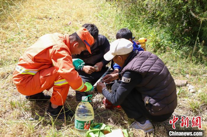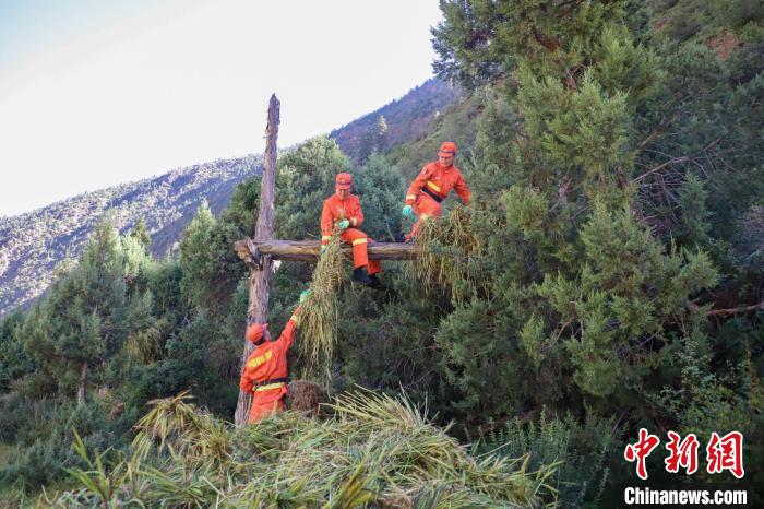 消防員將農牧民的青稞掛到架子上晾曬,這是當地的傳統青稞晾曬方式。劉星文 攝