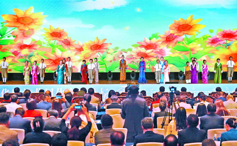 9月19日,由自治區黨委、自治區政府主辦的首屆西藏鑄牢中華民族共同體意識論壇在拉薩開幕。圖為在開幕式上,西藏珠峰少年合唱團演唱《珞巴少年》。記者 潘多 攝