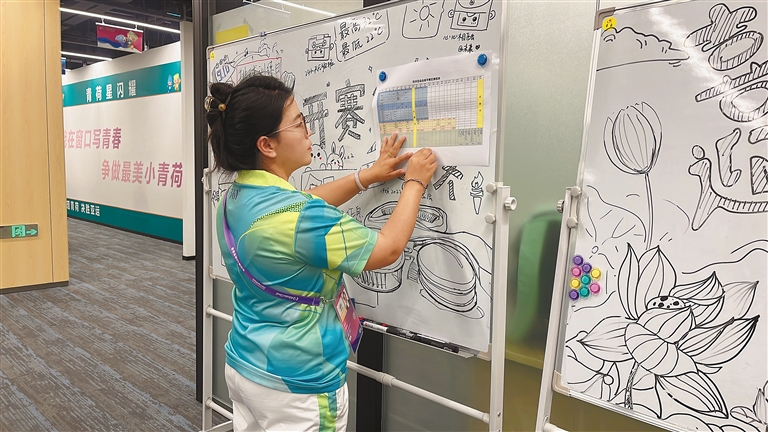 配圖:“小青荷”索朗德吉在張貼賽區賽程表。記者 萬靖 攝