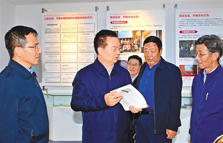10月7日,西藏自治區黨委書記王君正前往自治區社科院、社科聯調研。這是王君正在考察全區哲學社會科學組織體系建設、學術研究、人才工作情況。記者 旦增西旦 攝