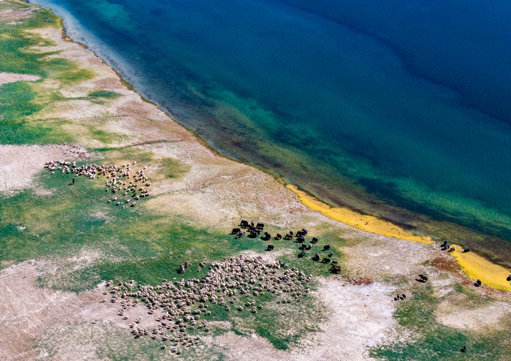 牧民在阿里地區日土縣班公湖畔放牧白絨山羊和牦牛(無人機照片,9月21日攝)。新華社記者 姜帆 攝
