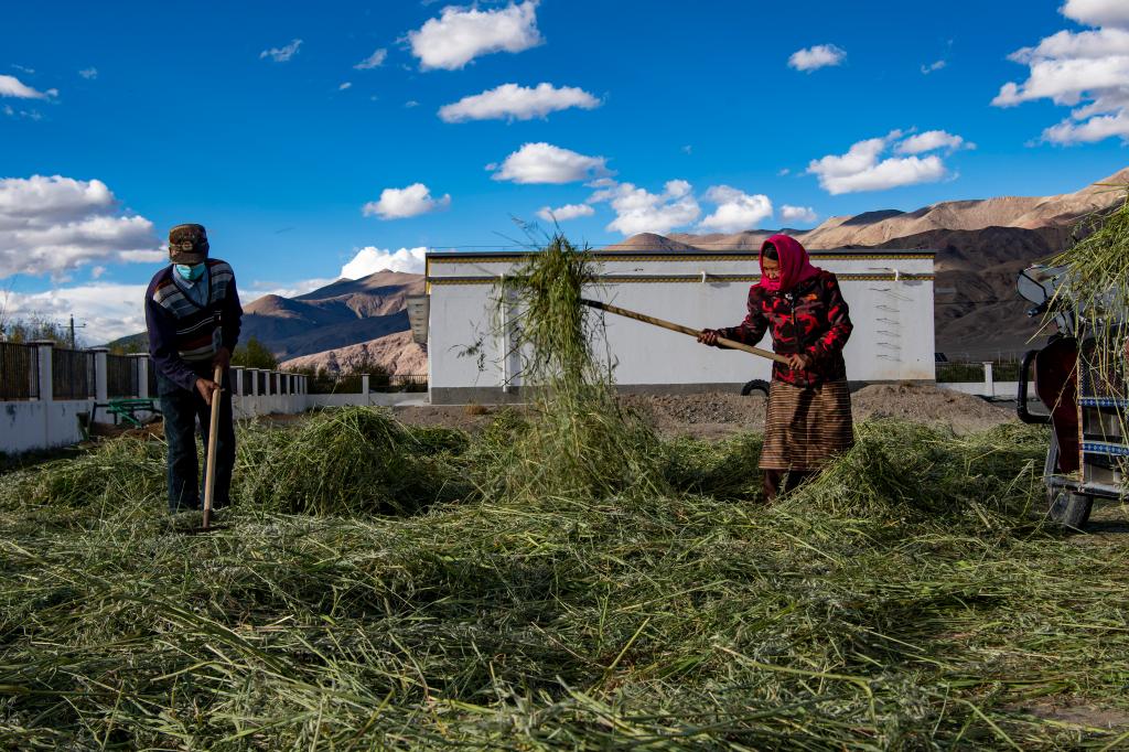 阿里地區噶爾縣昆莎鄉噶爾新村村民在場院晾曬紫花苜蓿(9月20日攝)。新華社記者 姜帆 攝