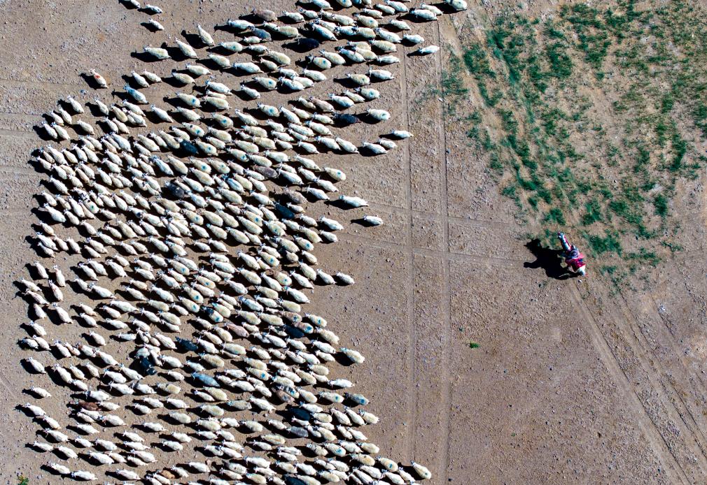 牧民在阿里地區日土縣班公湖畔放牧白絨山羊(無人機照片,9月21日攝)。新華社記者 姜帆 攝
