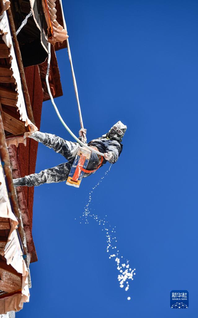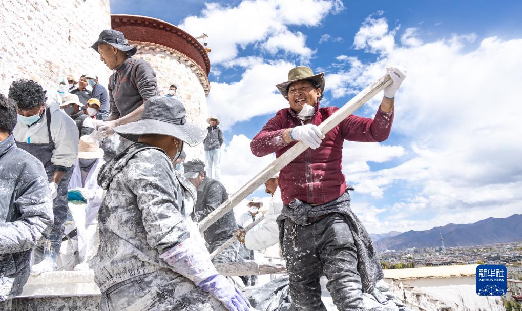 工作人員對(duì)布達(dá)拉宮外墻噴灑涂料(10月18日攝)。新華社記者 晉美多吉 攝