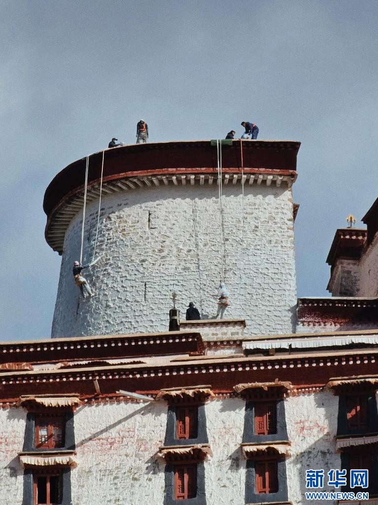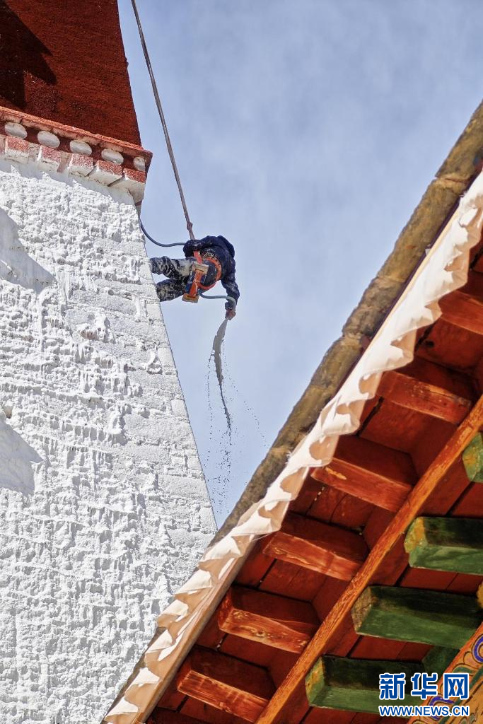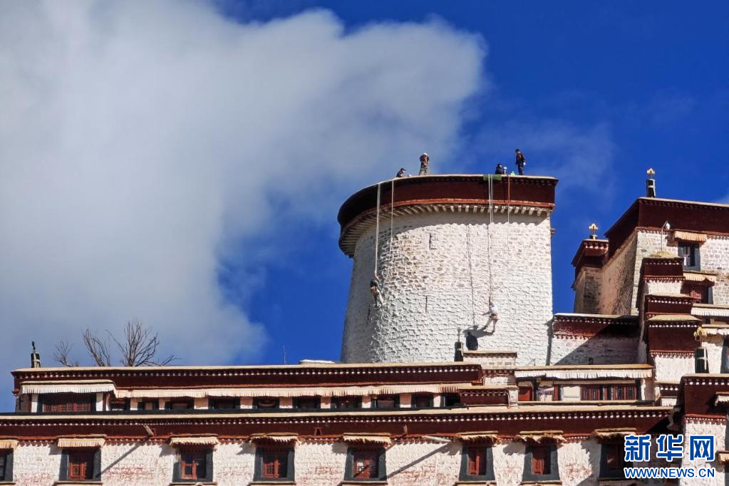 10月18日,布達拉宮“美容師”們在噴灑外墻。新華網 柑丹鴦琦 攝
