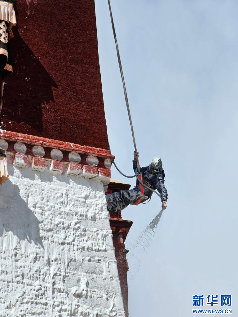 10月18日,布達拉宮“美容師”在噴灑涂料。新華網 柑丹鴦琦 攝