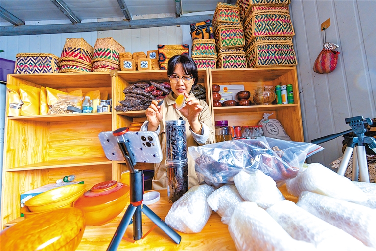 圖為日喀則市吉隆縣吉隆鎮吉甫村村民朗薩通過電商平臺銷售當地特產。記者 格桑吉美 攝