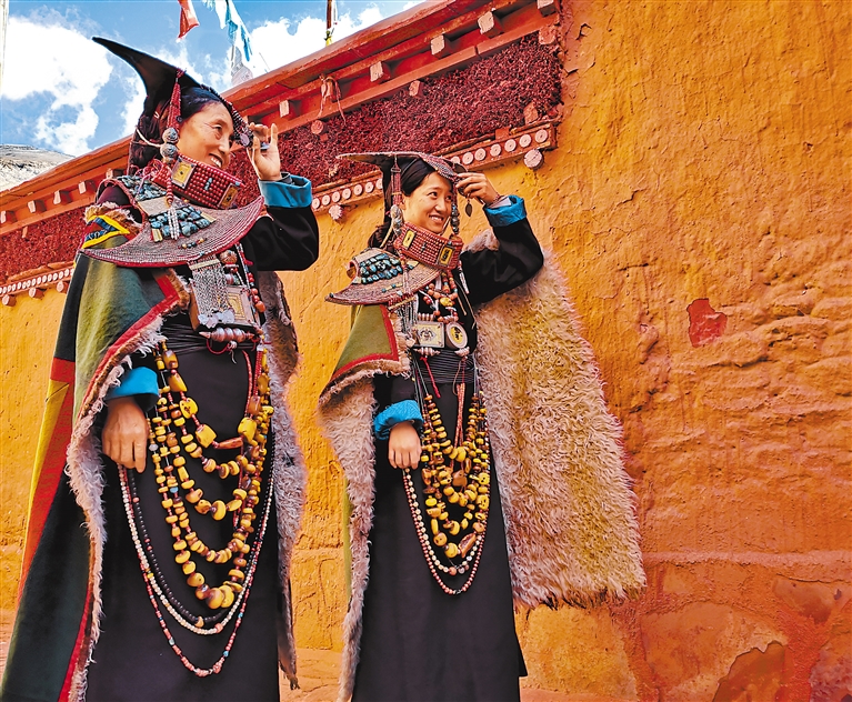 一大早,19歲的少女巴桑倉決和表姐巴桑普赤就開始整理各自傳承的“飛天服”。她們打開箱子,拿出精致的衣袍、披風和綴滿珠寶的頭飾、項鏈,鄭重地穿戴在身上。當整套“飛天服”呈現在眾人眼前時,大家無不為之驚嘆。
