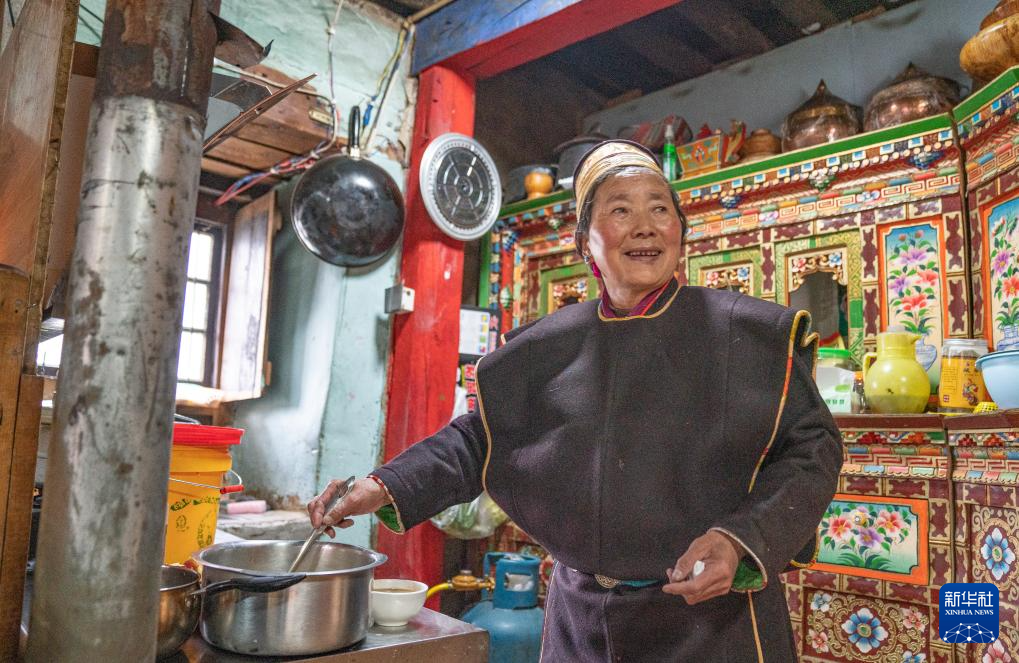 工布新年的大年初一,拉巴卓瑪一早就穿著傳統工布藏裝開始忙碌(11月14日攝)。新華社記者 黃耀漫 攝