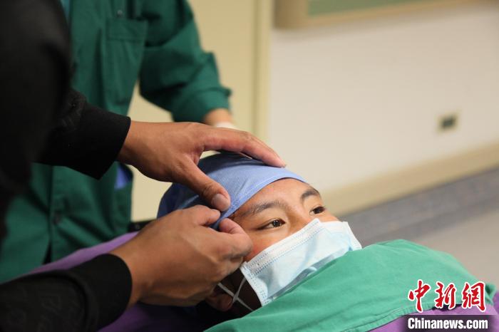 11月21日上午,扎著兩只麻花辮的澤巴永宗即將在北京大學第一醫院接受脊柱側凸矯形手術,要進手術室時,哥哥貢布鄧珠幫她將額角的頭發掖進手術帽中。中新網記者 朱賀 攝