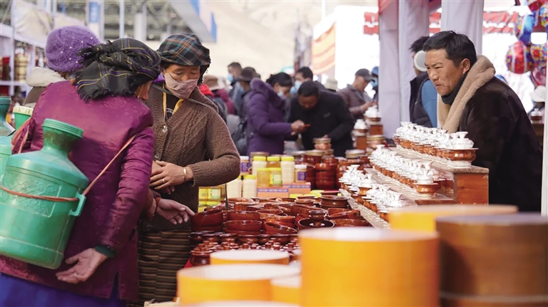 在物交會現(xiàn)場,民族手工藝產(chǎn)品、生活日用品、家具等各種商品琳瑯滿目。次仁金果藏帽、慈成藏香等種類繁多,生活日用品一應(yīng)俱全,尼泊爾商品更是吸引了眾多市民駐足圍觀。