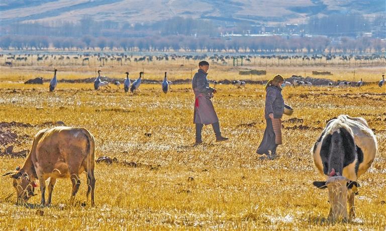 卡孜濕地是其中一個投食點?,F年43歲的洛桑次旦就住在附近,每天一大早,他都會到卡孜濕地放牧。“‘鄰居’越來越多了,十幾年的時間,黑頸鶴的數量從幾只增長到幾百只?!甭迳4蔚└嬖V記者,黑頸鶴和牛各吃各的,互不干擾,非常和諧。