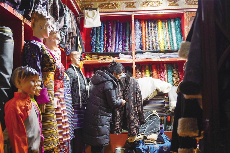 年輕一代熱愛傳統(tǒng),也擁抱時尚,渴望盡情扮靚生活,為傳統(tǒng)文化注入新的時代活力。“我這次專門買了一件拉薩傳統(tǒng)藏裝和一件‘泡泡袖’藏裝,打算在單位年會時穿,給大家看看西藏傳統(tǒng)服飾,也向大家展示藏裝時尚的一面。”次仁卓瑪說。