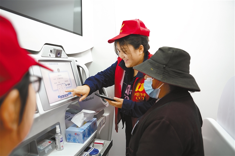 圖為大古公司員工在健康亭一體機前幫助達古村村民進行體檢。記者 武沛濤 攝