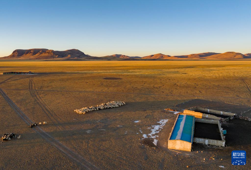 太陽落山,丹增家的羊從草場趕回棚圈(無人機照片,12月18日攝)。新華社發(fā)(旦增努布攝)