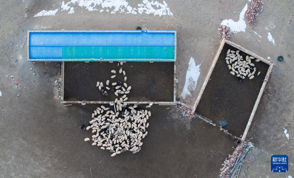 太陽落山,丹增家的羊回到棚圈。其中左側藍頂?shù)氖侨ツ晷律w的封閉式棚圈,右側是傳統(tǒng)的敞開式羊圈(無人機照片,12月18日攝)。新華社記者 姜帆 攝