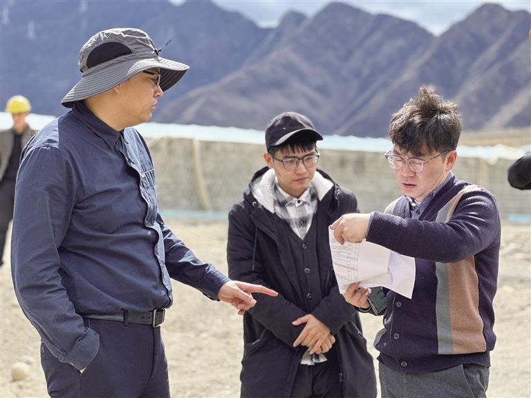 王宇(右一)在援藏項目現場核對施工圖紙。圖由王宇提供