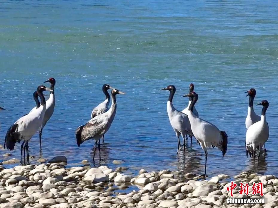 圖為黑頸鶴在雅魯藏布江畔覓食、嬉戲。德吉 攝