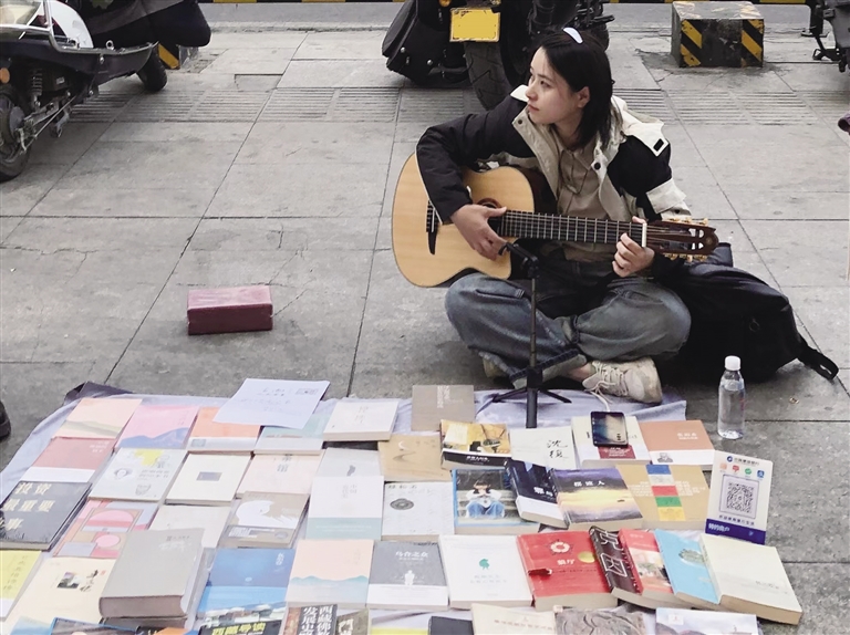 一般出攤時間是下午6點到9點,天氣暖和的話會到晚上10點左右才收攤。買書的顧客還是當地的年輕人多一點,游客倒沒有多少,生意也時好時壞,有時候一天能賣八九百元,有時候一晚上只能賣出去一本書。在沒有顧客的時候,方思潔就坐在攤位看書,“有時看了一半的書被顧客買走,我心里好著急,心想著還沒看完,想知道后面的故事。”她認為,擺地攤是展示自我的一種方式。