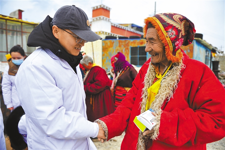 圖為高永濤在下鄉義診中向牧民贈藥并親切交流。記者 溫凱 攝