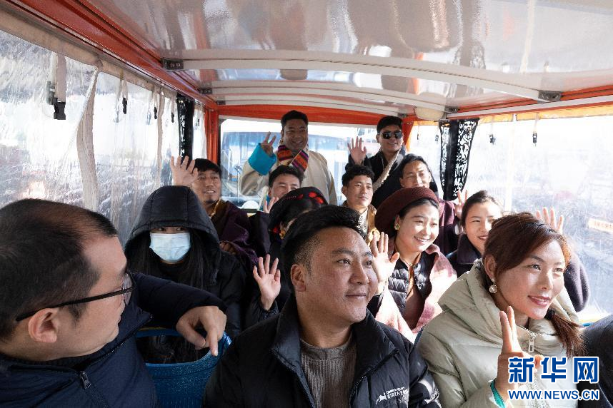 圖為墨竹工卡縣農牧民帶表團在南京高淳國際慢城景區觀光車內合影留念(12月24日攝)。新華網發 李騰 攝