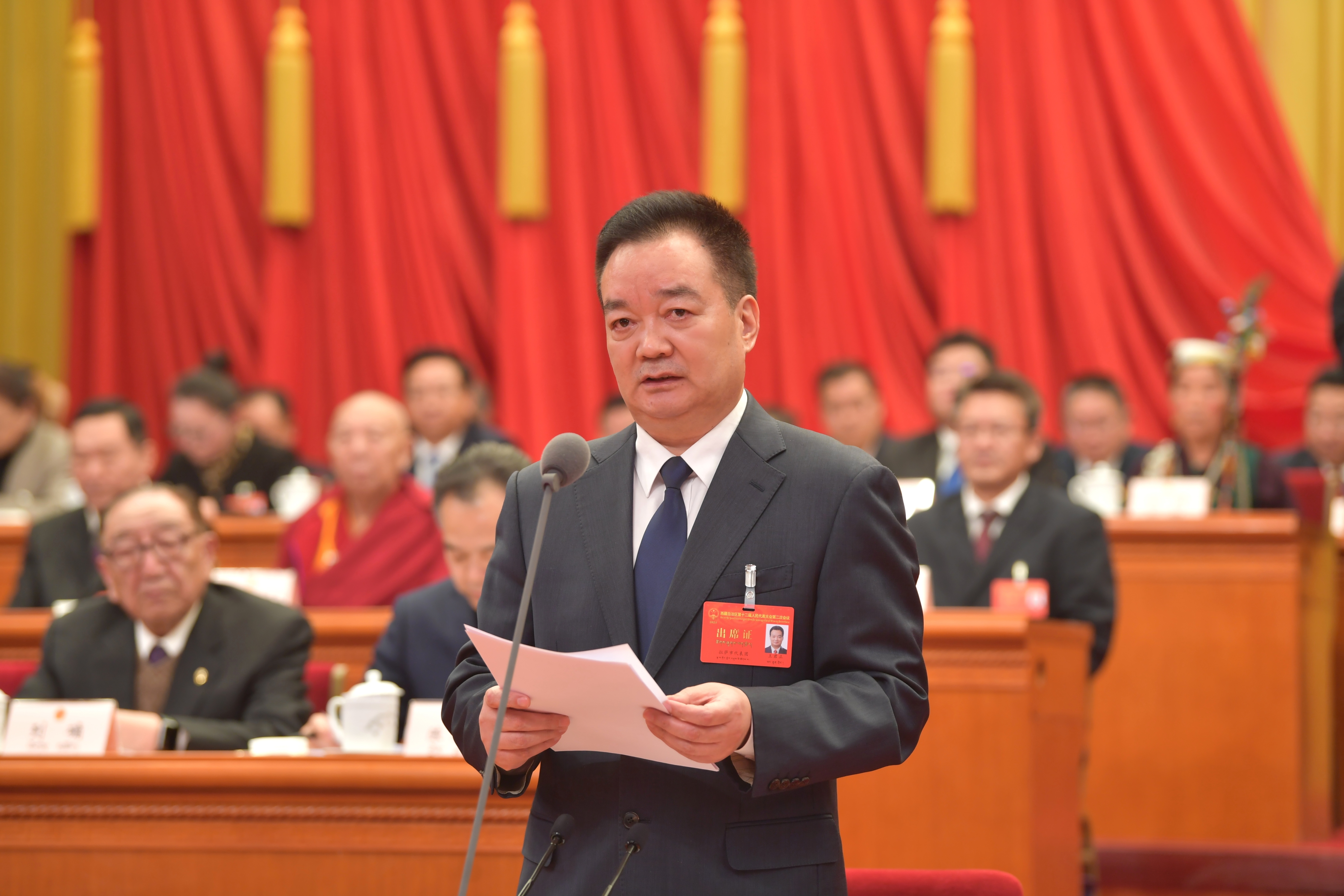 自治區人大常委會副主任旦科、堅參、桑頂·多吉帕姆·德慶曲珍、王峻、張延清、許成倉、江白、唐明英、劉柏呈、李文革、孫獻忠和秘書長劉光旭在主席臺前排就座。大會主席團其他成員和自治區省軍級領導在主席臺就座。