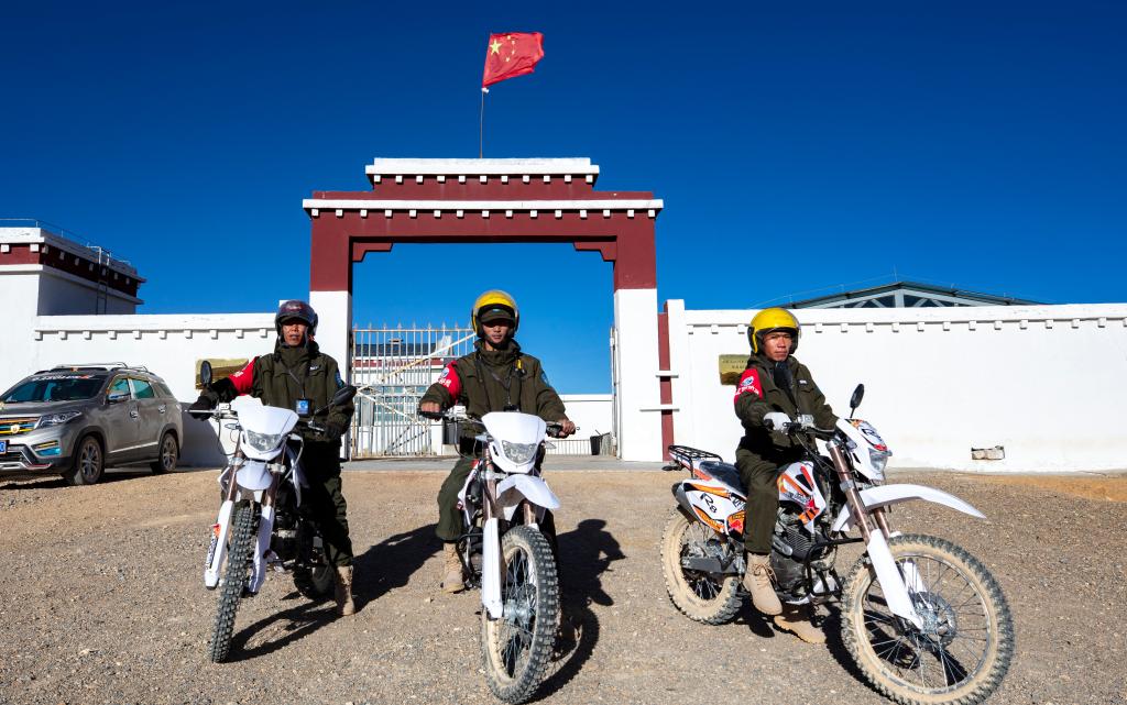 巡護(hù)隊(duì)員們騎上山地摩托車(chē),準(zhǔn)備出發(fā)巡護(hù)(2023年12月17日攝)。新華社記者 姜帆 攝