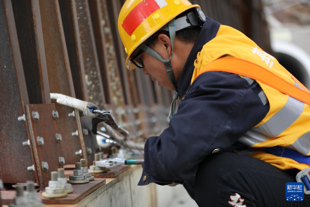 加查橋隧工區副工長張亮在檢查藏木特大橋螺絲銹蝕情況(1月27日攝)。新華社發(拉巴次仁攝)