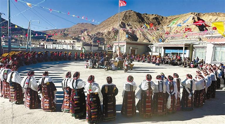 新春佳節,日喀則市聶拉木縣門布鄉門卡麥村的村民們身著華麗的服飾翩翩起舞,以飽滿的熱情將“甲諧”(意為隆重的歌舞表演)的獨特魅力展現得淋漓盡致,以此來慶賀新年的到來。 圖為演出現場。西藏日報記者 格桑倫珠 攝