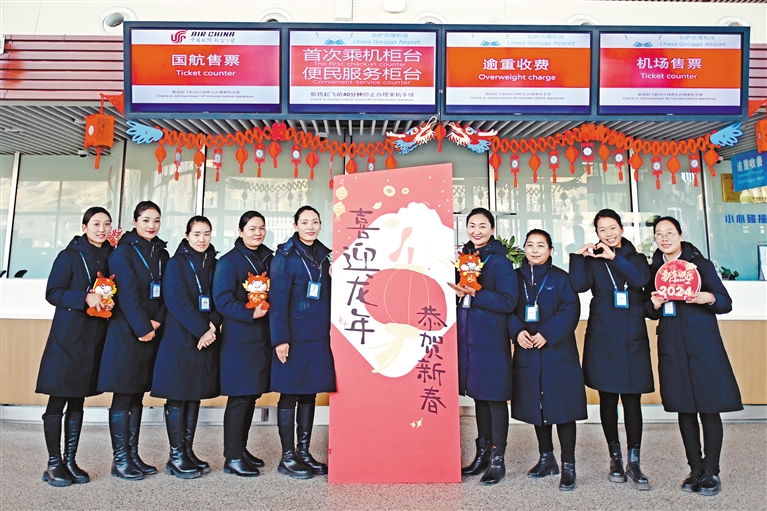 春運期間,西藏民航人為廣大旅客架起歸途的平安天路,保障安全、順暢、高效出行。圖為貢嘎機場旅服部工作人員在航站樓現場為旅客送上新年祝福。