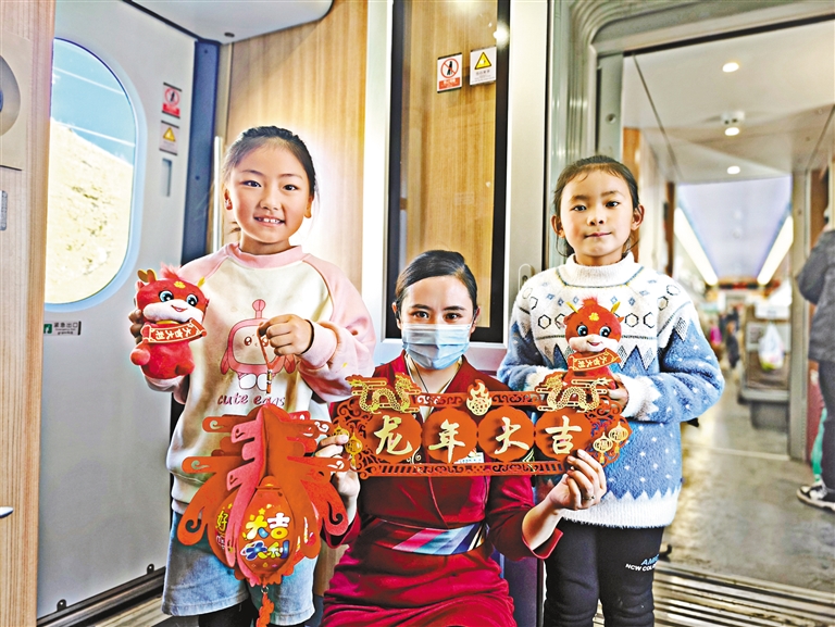 春運期間,鐵路部門踐行“天路格桑花”服務品牌理念,將車站、列車裝飾一新,為旅客提供優質、貼心的服務。圖為拉林鐵路動車組上的乘務員把龍年禮物送給孩子們。