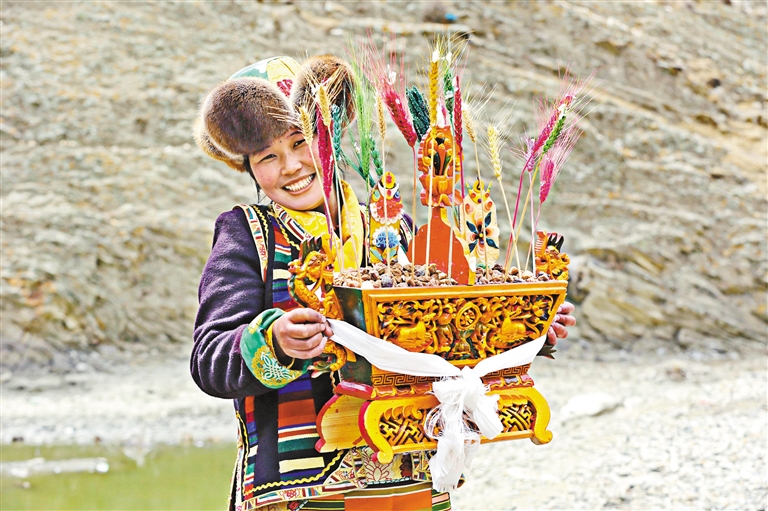 制作“切瑪”盒是藏歷新年一項歷史悠久的習俗,代表著群眾對五谷豐登的美好期盼。圖為瓊結縣唐布齊村群眾身著節日盛裝,端出精心制作的“切瑪”盒。